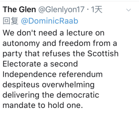 苏格兰人对于保守党政府的这项动议更是嗤之以鼻,在外交大臣拉布的涉港声明推文下,一苏格兰人回击说:“我们不需要一个拒绝苏格兰举行第二次独立公投的政党来宣讲香港的“自治和自由”。