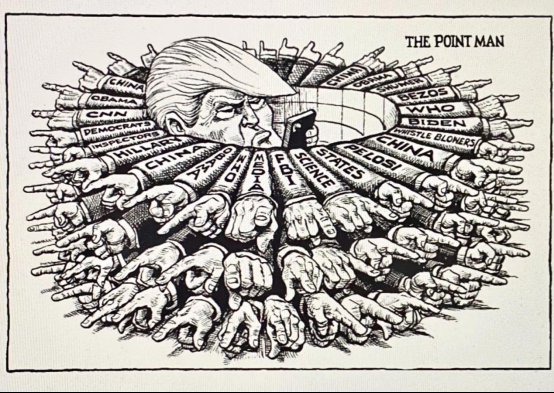 西方媒体就美国涉港制裁发表的漫画 特朗普手持手机 ,千手指四方,在他的攻击对象中包括中国世卫组织以及美国国内众多的反对势力。