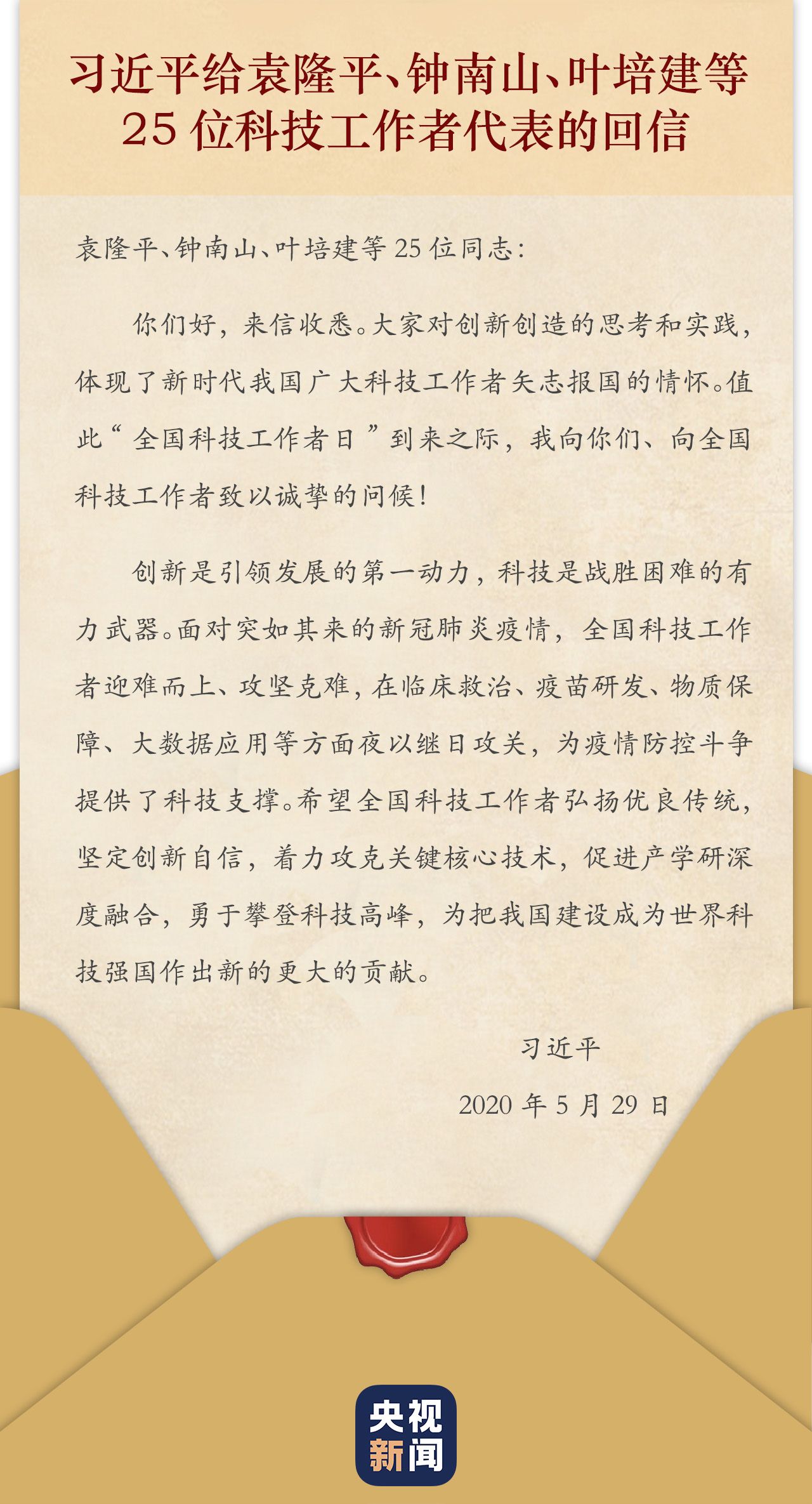 在第四个“全国科技工作者日”到来之际,习近平总书记给袁隆平、钟南山、叶培建等25位科技工作者代表回信,向他们并向全国科技工作者致以诚挚的问候。