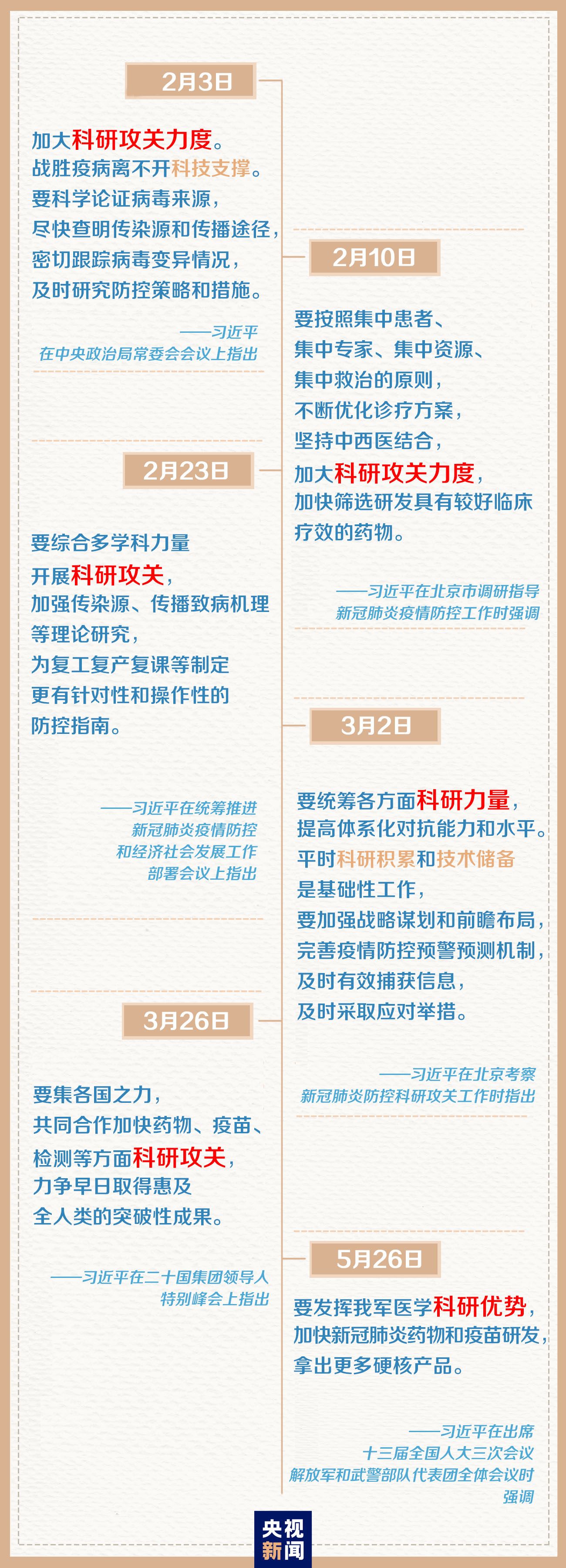 5月8日,中共中央在中南海召开党外人士座谈会。习近平在座谈会中肯定“武汉保卫战、湖北保卫战取得决定性成果,疫情防控阻击战取得重大战略成果”的同时,还提到:“不到一周时间就确定了新冠病毒的全基因组序列并分离得到病毒毒株,及时推出多种检测试剂产品,迅速筛选了一批有效药物和治疗方案,多条技术路线的疫苗研发进入临床试验阶段”,这些都在“紧紧依靠科技进步”中取得。