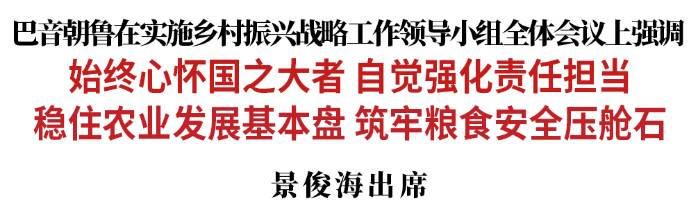 今天(6月5日),省委实施乡村振兴战略工作领导小组召开全体会议。省委书记、省委实施乡村振兴战略工作领导小组组长巴音朝鲁主持会议并讲话。他强调,要深入贯彻习近平总书记关于“三农”工作的重要讲话和重要指示精神,始终心怀国之大者,自觉强化责任担当,全面实施乡村振兴战略,着力补齐“三农”领域短板,坚决稳住农业发展基本盘,筑牢粮食安全压舱石,为做好“六稳”“六保”工作、完成全年目标任务提供有力支撑。省长、省委实施乡村振兴战略工作领导小组组长景俊海出席会议。