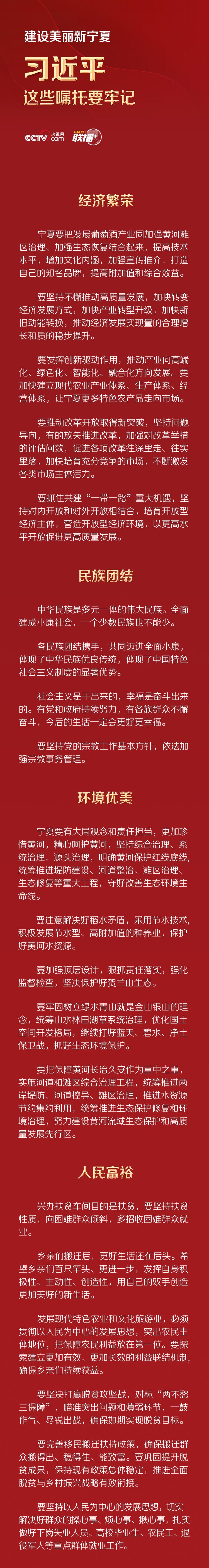 在考察中,习近平看得仔细,问得详细,对宁夏各项工作取得的成绩给予肯定,并就经济繁荣、民族团结、环境优美、人民富裕等问题对宁夏提出具体要求。央视网《联播+》特梳理,与您一同学习领悟。