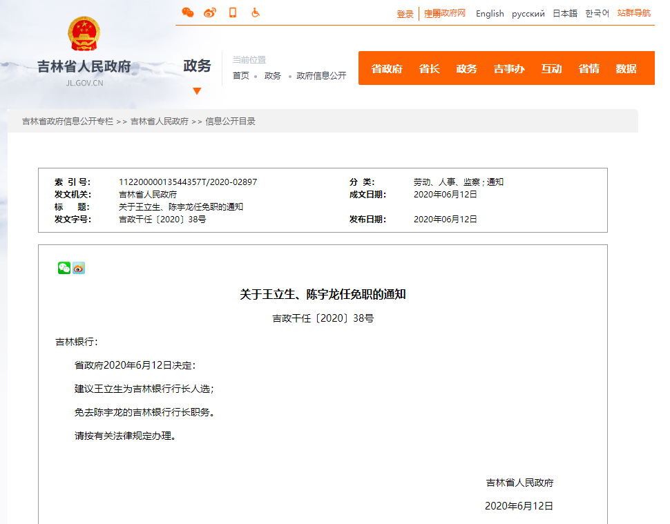 省政府2020年6月12日决定:建议王立生为吉林银行行长人选;免去陈宇龙的吉林银行行长职务。请按有关法律规定办理。
