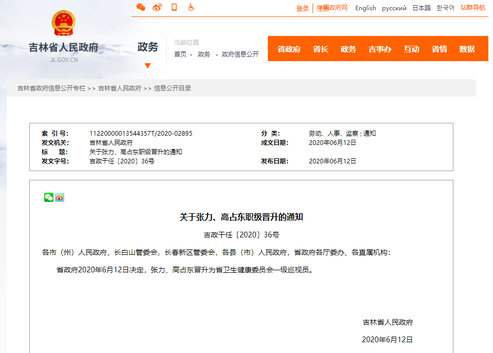 省政府2020年6月12日决定,张力、高占东晋升为省卫生健康委员会一级巡视员。