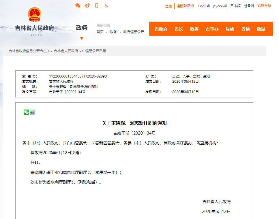 宋晓辉为省工业和信息化厅副厅长(试用期一年);刘志新为省水利厅副厅长(列张和后)。