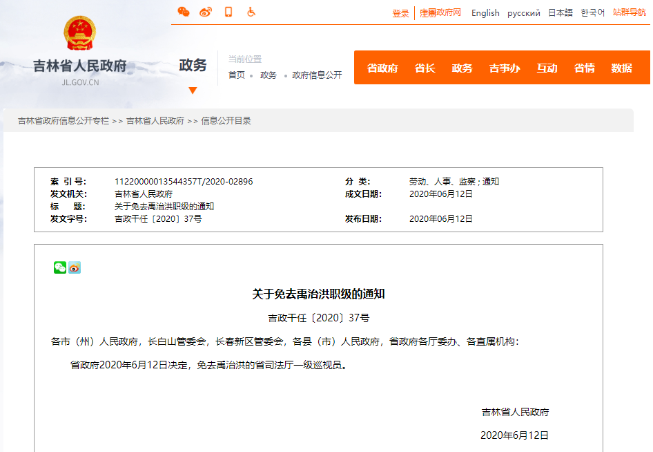 省政府2020年6月12日决定,免去禹治洪的省司法厅一级巡视员。