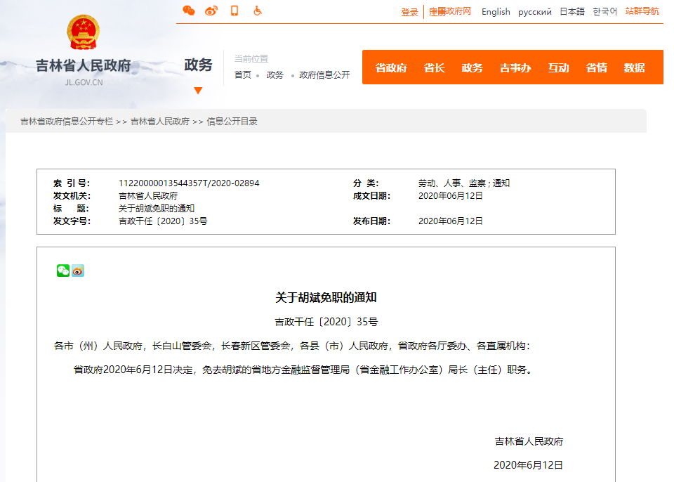 省政府2020年6月12日决定,免去胡斌的省地方金融监督管理局(省金融工作办公室)局长(主任)职务。