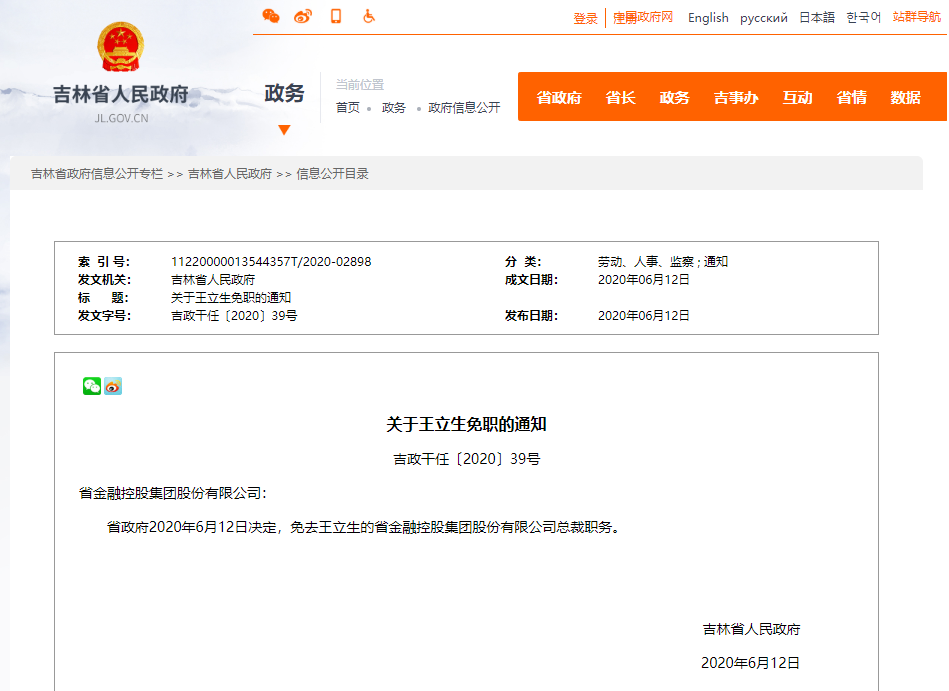 省政府2020年6月12日决定,免去王立生的省金融控股集团股份有限公司总裁职务。