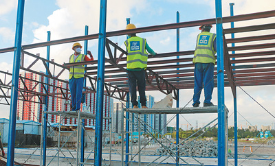 中国建筑集团有限公司援建的马尔代夫外籍劳工隔离观察设施施工现场,工人们在搭建桁架。