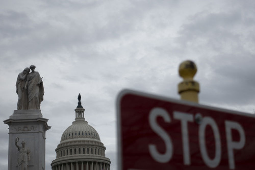 这是2020年2月13日拍摄的美国国会。图片前景是一个有“停止”字样的路牌。新华社记者 刘杰 摄