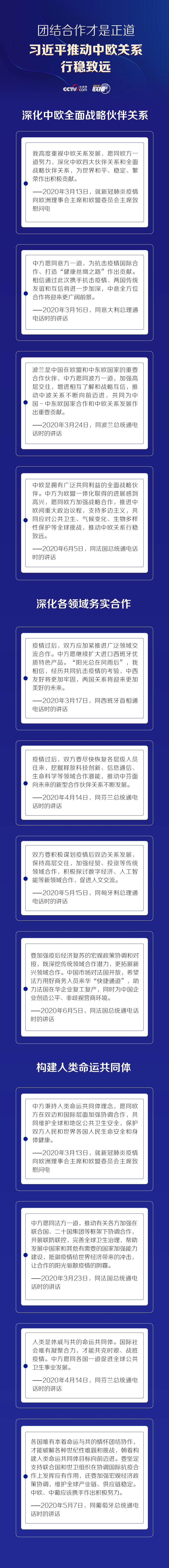 新冠肺炎疫情发生以来,习近平主席多次与欧盟及其成员国领导人进行沟通,表达对国际抗疫合作的坚定支持,呼吁积极谋划疫情后各领域务实合作,为推动中欧关系行稳致远注入新动力。央视网《联播+》特梳理相关内容,以飨读者。
