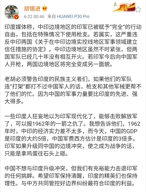 中国不想与印度升级冲突,但我们有充裕能力击退印军的任何挑衅。希望印军保持清醒,印度的精英们也保持理性。与中方共同管控好边界纠纷最符合印度的利益。