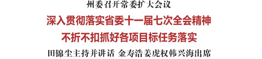 6月23日,州委召开常委扩大会议,传达学习省委十一届七次全会精神,研究部署我州贯彻落实工作。省委常委、州委书记田锦尘主持会议并讲话。州委副书记、州长金寿浩,州人大常委会主任姜虎权,州政协主席韩兴海出席会议。