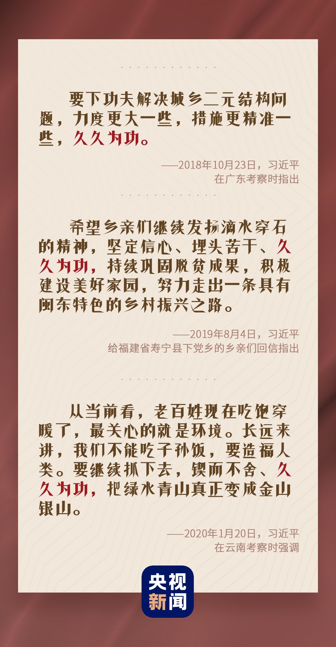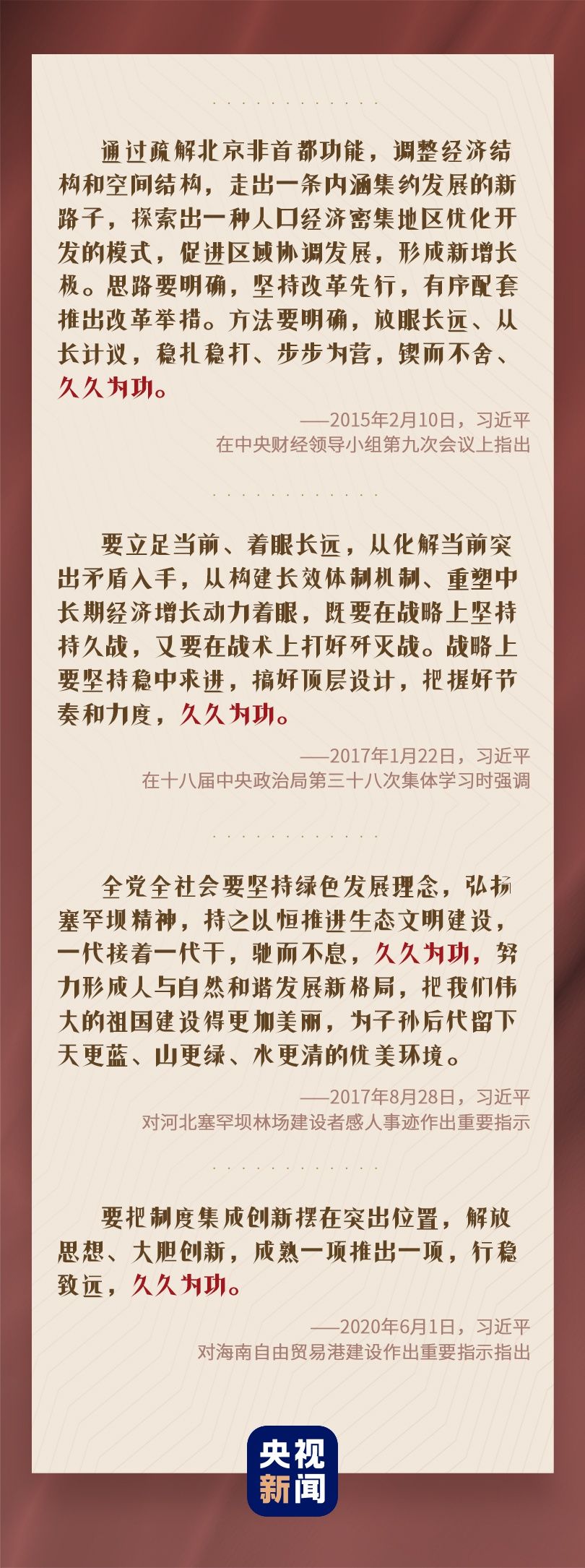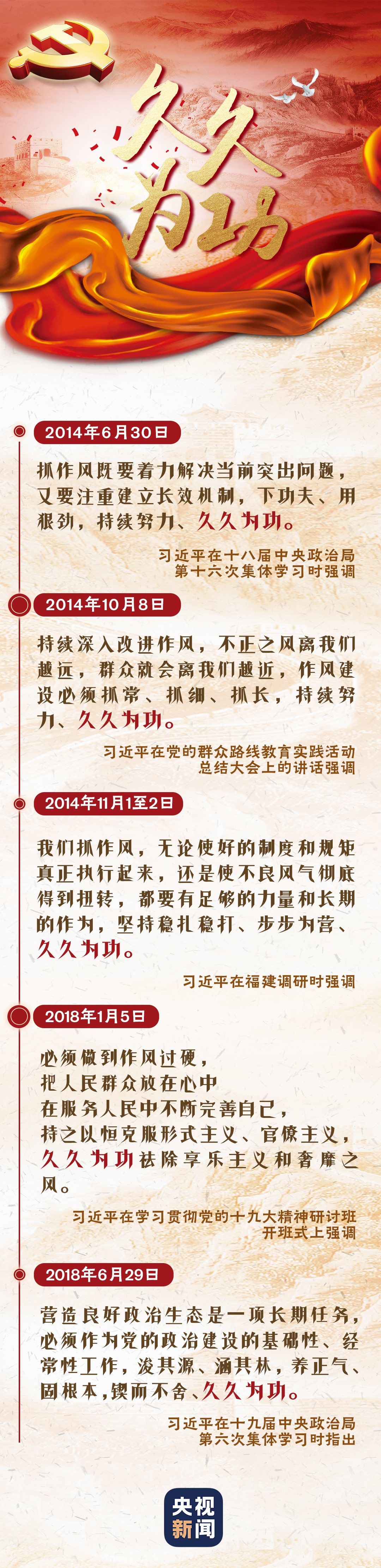 党的十八大以来,习近平总书记多次重要讲话中,反复强调这个词——久久为功。抓作风、促改革、为民生,都需要持续努力,锲而不舍,久久为功。