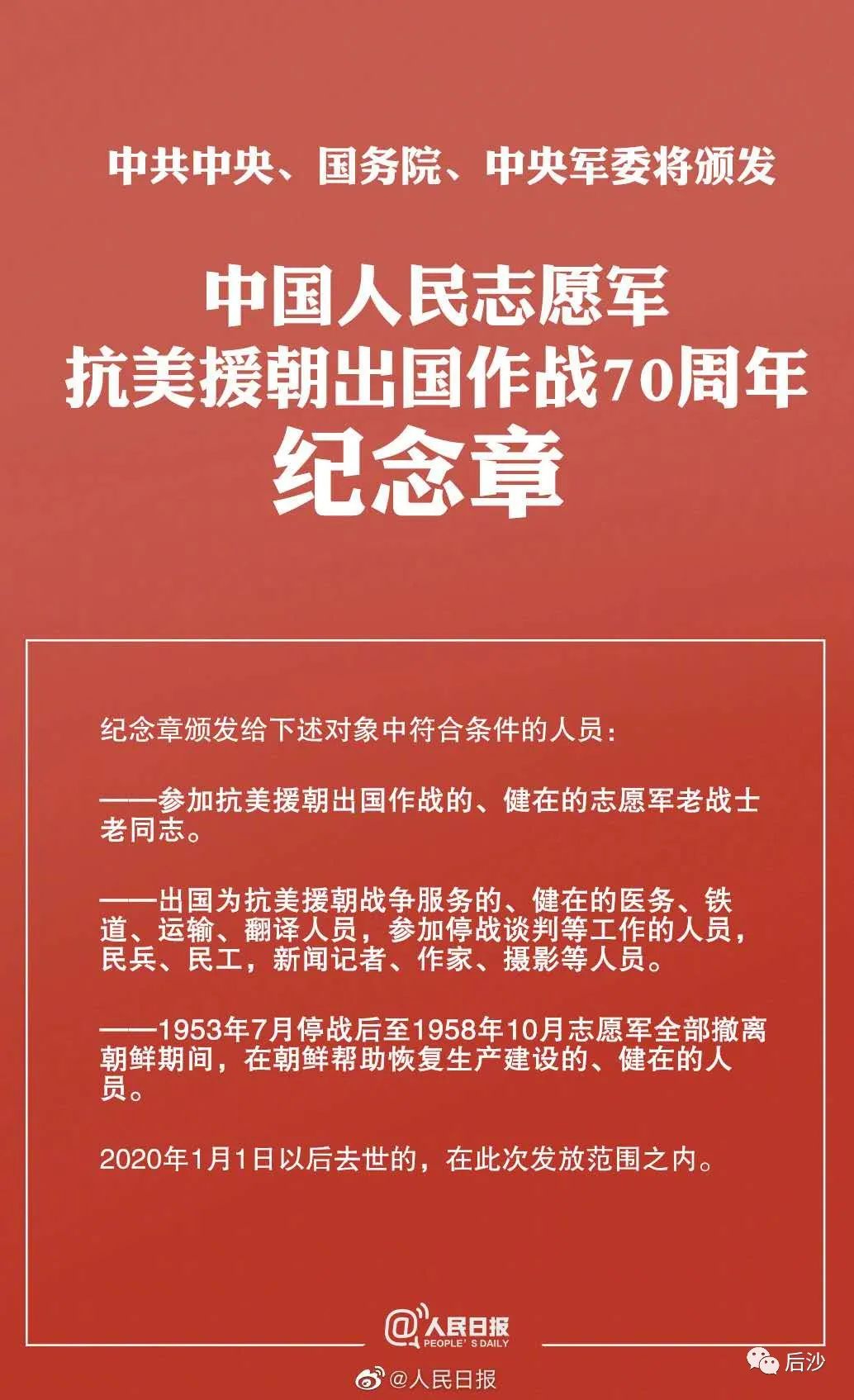 今年是中国人民志愿军抗美援朝出国作战70周年,中共中央、国务院、中央军委将颁发“中国人民志愿军抗美援朝出国作战70周年”纪念章。