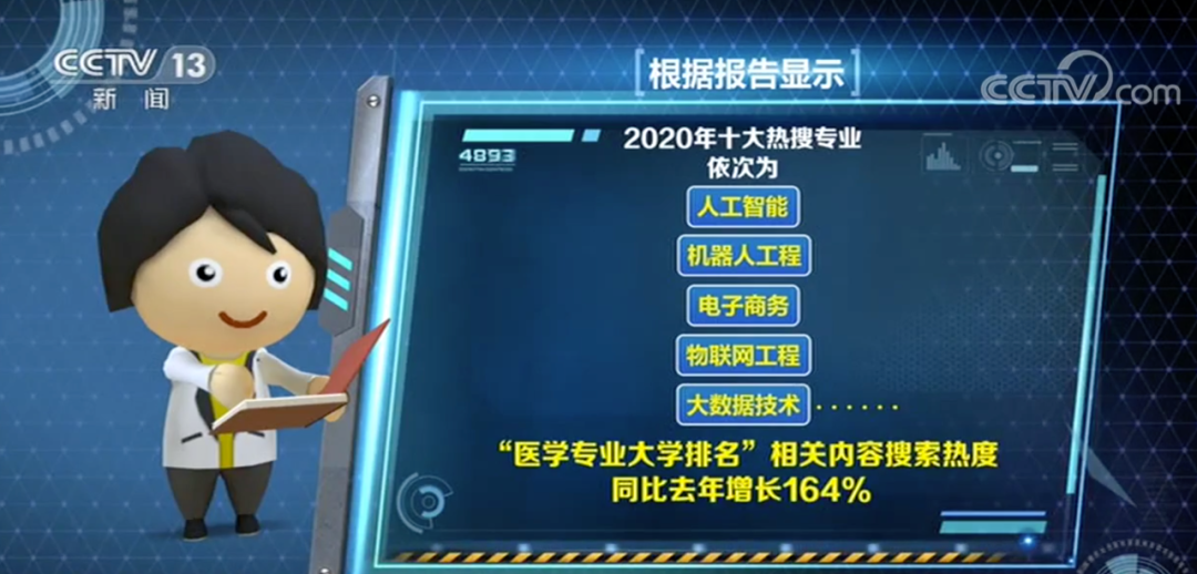 报告显示,2020年十大热搜专业依次为人工智能、机器人工程、电子商务、物联网工程、大数据技术等。“医学专业大学排名”相关内容搜索热度同比去年增长164%。