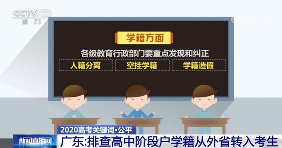 广东省对高中阶段户籍、学籍从外省转入广东省的考生资格进行全面排查,各级教育行政部门要重点发现和纠正人籍分离、空挂学籍和学籍造假;各级公安机关要严把迁移入户关,对于已经落户的,如果查实以在粤参加高考为目的、弄虚作假迁入广东省的,一律予以清退。