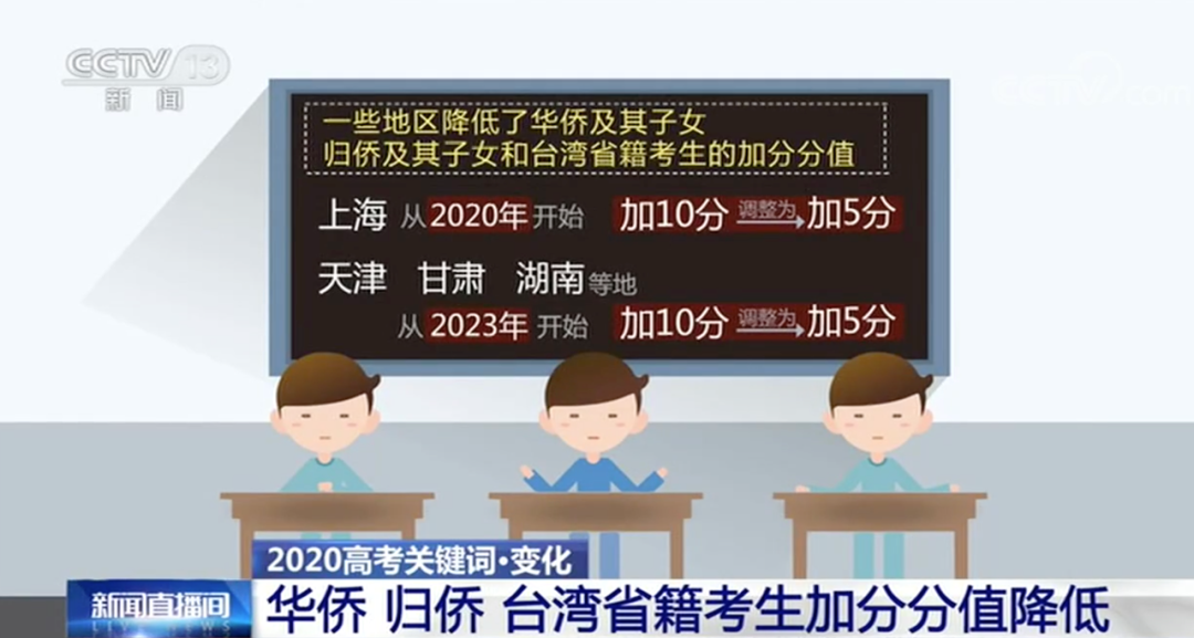 近日,各地也相继公布了高考加分及优先录取政策,部分地区的加分政策也有所调整。■ 大部分地区加分政策继续“瘦身”甘肃省取消了9个加分项目,包括5项全国性加分项和4项甘肃省地方性加分项,主要涉及体育特长、奥赛、科技创新大赛、省级优秀学生、艺术特长等。■ 部分地区降低华侨、归侨和台湾省籍考生的加分分值