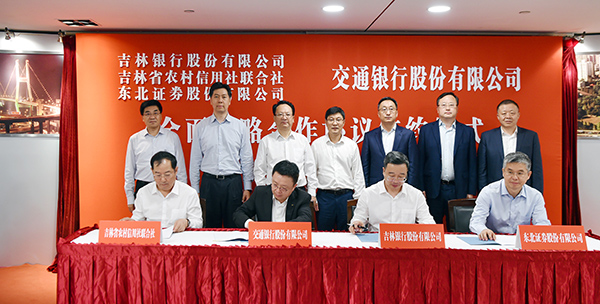 抵达上海以来,吉林省代表团持续在上海深入开展经贸交流活动。图为省委副书记、省长景俊海与交通银行董事长任德奇举行会谈,并见证交通银行分别与吉林银行、吉林省农村信用社联合社、东北证券公司签署合作协议。