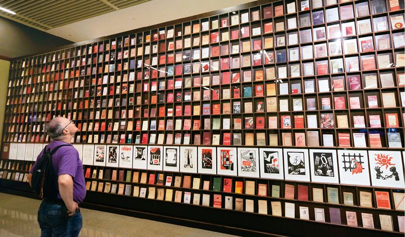 △2018年5月9日,一位外国观众被北京“真理的力量——纪念马克思诞辰200周年主题展览”中一面展示不同国家出版的500多种《共产党宣言》的书墙所吸引。