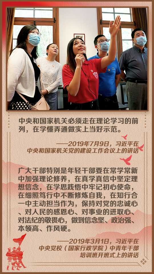 2020年1月8日,习近平在“不忘初心、牢记使命”主题教育总结大会上指出:“要把学习贯彻党的创新理论作为思想武装的重中之重,同学习马克思主义基本原理贯通起来,同学习党史、新中国史、改革开放史、社会主义发展史结合起来,同新时代我们进行伟大斗争、建设伟大工程、推进伟大事业、实现伟大梦想的丰富实践联系起来,在学懂弄通做实上下苦功夫,在解放思想中统一思想,在深化认识中提高认识,切实增强贯彻落实的思想自觉和行动自觉。”