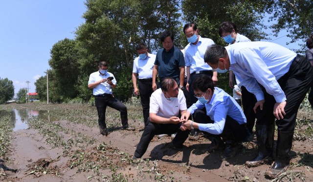 7月8日,巴音朝鲁在长岭县流水镇金宝村,就农作物受灾情况进行调研