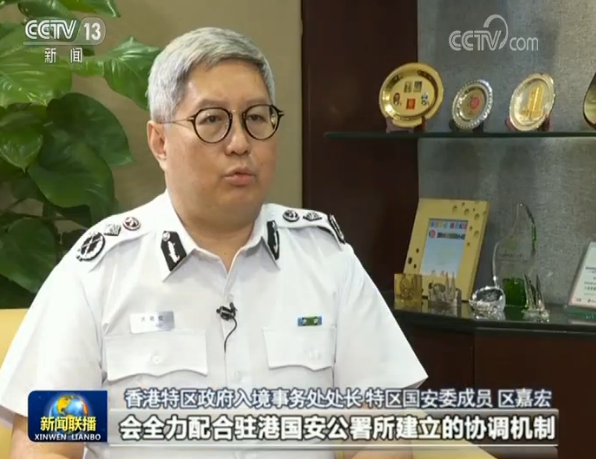 香港特区政府入境事务处处长、特区国安委成员 区嘉宏:在我带领下的香港入境处会全力配合驻港国安公署所建立的协调机制。入境处会继续做好执法和服务工作,尽力在方便人员往来的同时,防止任何不受欢迎和危害国家安全的人士进入香港、破坏香港的治安。