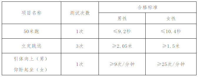体能测评的项目和标准,按照《国家学生体质健康标准(2014年修订)》的有关规定执行。具体如下: