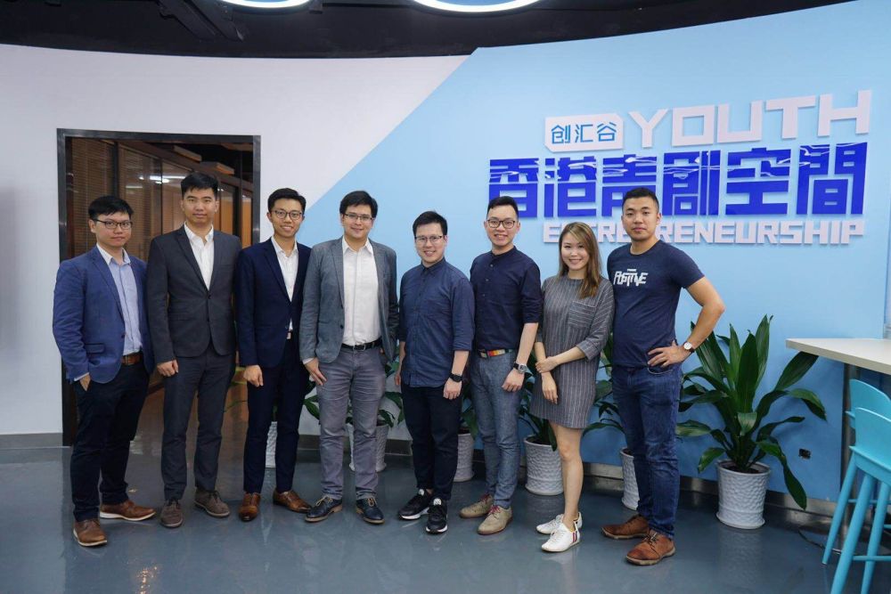 2019年4月麦成灏(左四)带领香港青年创业团队进驻广州南沙“创汇谷”粤港澳青年文创社区香港青创空间。(图片由受访者提供)