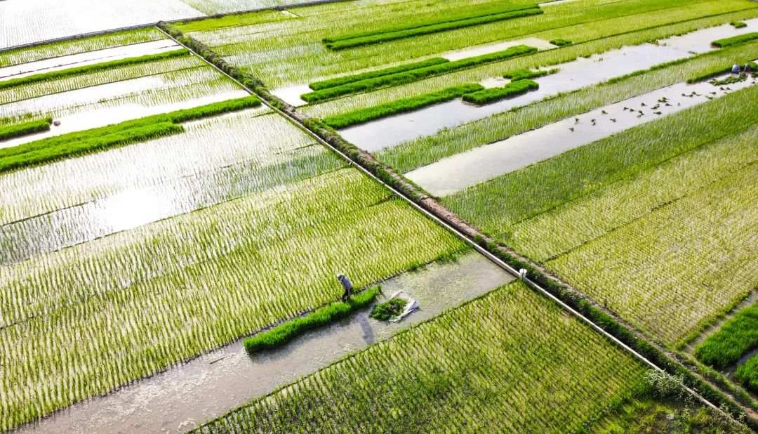 △2020年6月14日,农民在洛阳市孟津县会盟镇黄河岸边的万亩优质水稻种植示范基地内移栽水稻秧苗(无人机照片)。新华社发(黄政伟 摄)