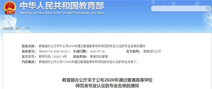 近日,教育部公布2020年通过普通高等学校师范类专业认证的专业名单。东北师范大学生物科学专业等4个专业通过第三级专业认证,北京师范大学历史学专业等155个专业通过第二级专业认证。认证结论有效期六年,自2020年7月起至2026年6月止。