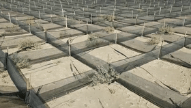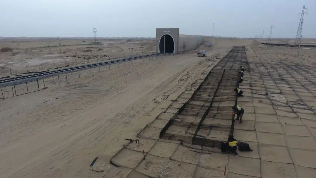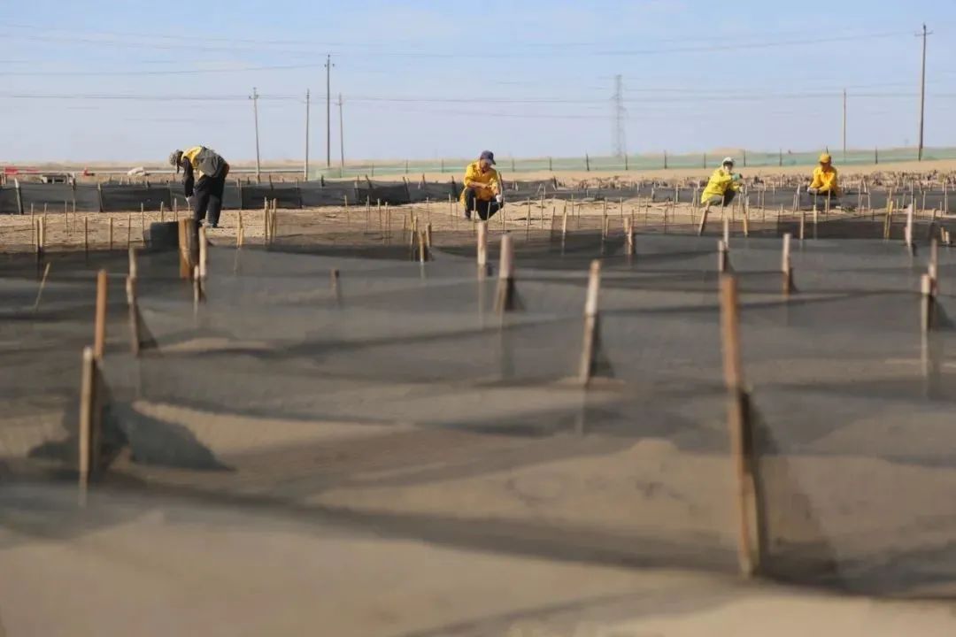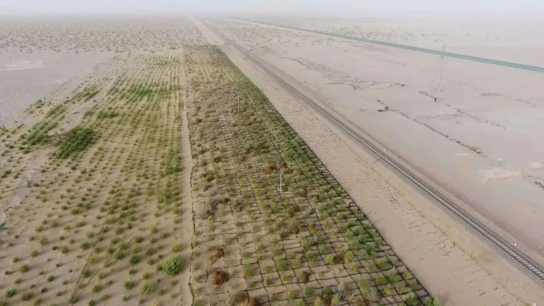铁路治沙人采取“高、中、低”尼龙网格相配套的方式阻沙,并在防沙网格中种下了耐旱易活的梭梭、棱条、红柳等植物,利用这些耐旱植物有效“锁住”沙地水分,形成区域性的“小生态”,防止沙害蔓延。
