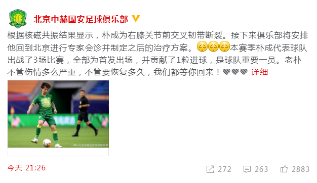根据核磁共振结果显示,朴成为右膝关节前交叉韧带断裂。接下来俱乐部将安排他回到北京进行专家会诊并制定之后的治疗方案。