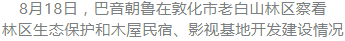 “一山有四季,十里不同天。”敦化市老白山林区植被垂直带显著、生物多样性丰富、森林生态系统完整、湿地类型独特,是天然的森林氧吧。雨后的林间云雾缭绕、空气清新,沿着蜿蜒山路,巴音朝鲁仔细察看林区生态保护和木屋民宿、影视基地开发建设情况。近年来,老白山林区坚持绿色发展战略,全力推进原始生态森林体验区建设,精心打造的关东民俗一条街、新农村题材影视基地、伴山别苑木屋群等景点项目受到游客热捧,生态旅游人气迅速升温。对此,巴音朝鲁给予充分肯定。他要求当地党委、政府要坚定不移走生态优先、绿色发展之路,坚持保护与发展并重、生态与旅游并举,不断丰富旅游开发内涵,加快构建“吃、住、行、游、娱、购”全产业链,努力把老白山林区打造成为延边生态旅游打卡地、转型发展新引擎、绿色发展新样板。