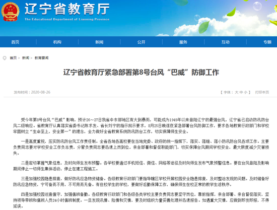 受今年第8号台风“巴威”影响,预计26~27日我省中东部地区有大到暴雨,可能成为1949年以来登陆辽宁的最强台风,辽宁省已启动防汛防台风二级响应。省教育厅认真落实省委书记陈求发、省长刘宁的指示批示要求,8月25日晚连夜紧急部署台风防御工作,要求各地教育行政部门和学校牢固树立“生命至上,安全第一”的理念,全力做好全省教育系统防汛防台工作,切实保障师生安全。