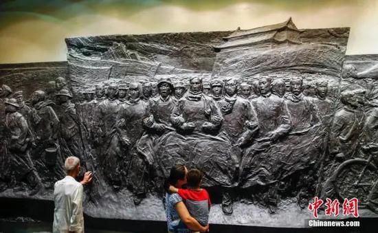 资料图:民众参观北京宛平城内中国人民抗日战争纪念馆的浮雕。中新社发 张浩 摄