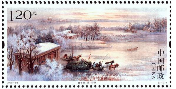 第一枚“圣湖如画”,画面表现了秋季查干湖碧波荡漾、芦苇摇曳、水鸟翔集的静谧壮美的景色。远处为查干湖畔的引松工程纪念碑。第二枚“渔村冬景”,画面表现了冬季查干湖畔为冬捕做准备忙碌的渔民身影。白雪皑皑的大地、高挂的雾凇、乡村屋舍和渔民共同构成了查干湖特有的渔猎生活景象。第三枚“冰湖腾鱼”,画面表现了冬捕开网后,冰封的湖面上人头攒动,一片热闹景象。近处鱼跃而出、湖面沸腾,远处高头大马拉动绞盘,呈现出一幅鱼跃人欢冬捕忙的丰收景象。