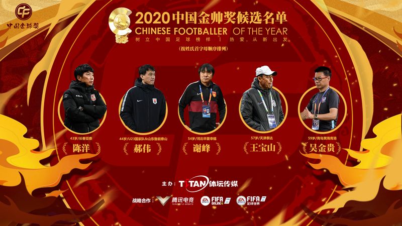 2020中国金帅奖共有5人参与竞逐。和去年李铁无争议地当选“金帅”有所不同,2020中国足球最佳教练的称号谁属颇具悬念。吴金贵和谢峰都在2020中超联赛中克服困难,率领球队完成赛季目标。在王宝山和郝伟的带领下,天津泰达和山东鲁能也在足协杯赛中有上佳的发挥。在诸多洋帅的夹击下,年轻教头陈洋一举率领长春亚泰杀回冲超,功勋卓著。