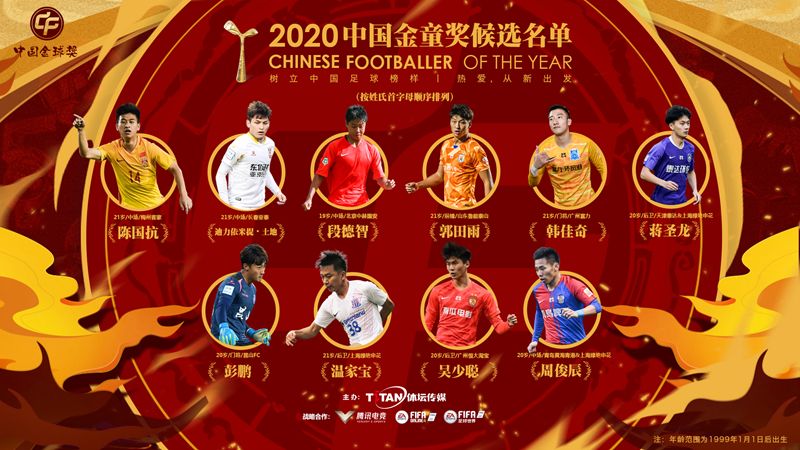 2020中国金童奖评选标准依然锁定U21年龄组,中超联赛全勤王韩佳奇、绝杀恒大的山东鲁能小将郭田雨、中超亚冠代表双队双线作战的蒋圣龙和周俊辰、中甲联赛中表现突出的陈国抗和彭鹏,以及代表国青出战中乙且有上佳发挥的小将段德智均入围候选。2019年朱辰杰毫无悬念地成为中国金童奖得主,但2020的“金童”之争,一定比预想中还要激烈。