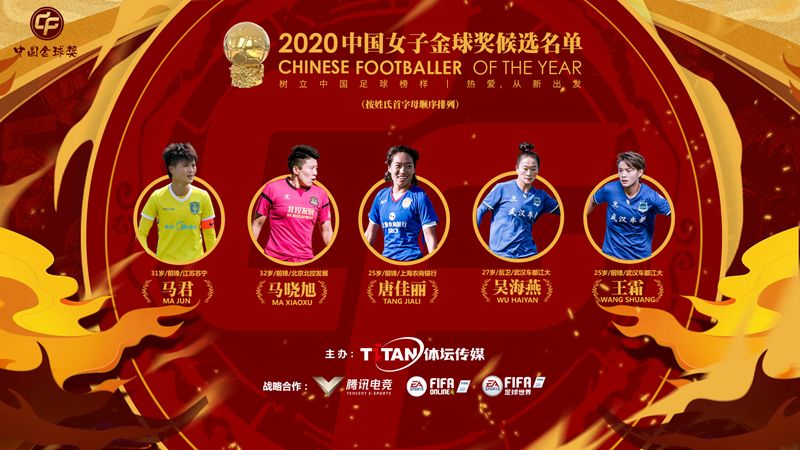 除了年初的奥运会预选赛和国内女足联赛之外,2020年的女足赛事并不多,2020中国女子金球奖采用特邀评委投票的方式决出得主。候选人中包括三届中国女子金球奖得主王霜、去年进入女子金球奖前三名的吴海燕、江苏苏宁队队长马君以及年初在国家队赛事中有惊艳表现的唐佳丽。此外,32岁的老将马晓旭也进入本次中国女子金球奖的候选人名单。
