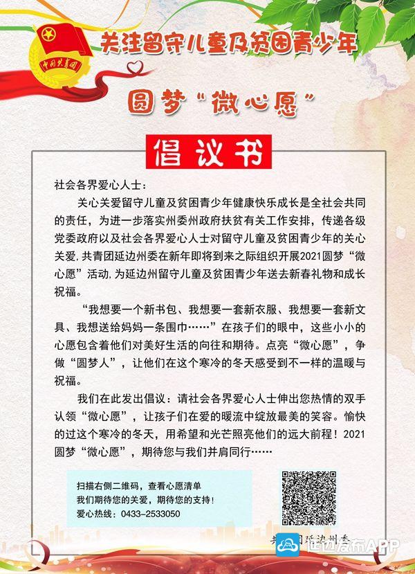 关心关爱留守儿童及贫困青少年健康快乐成长是全社会共同的责任,为进一步落实州委州政府扶贫有关工作安排,传递各级党委政府以及社会各界爱心人士对留守儿童及贫困青少年的关心关爱,共青团延边州委在新年即将到来之际组织开展2021圆梦“微心愿”活动。为延边州留守儿童及贫困青少年送去新春礼物和成长祝福。
