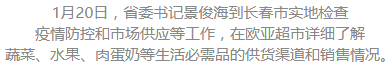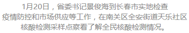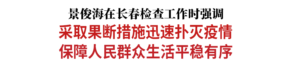 今天(1月20日),省委书记景俊海到长春市,实地检查疫情防控、市场供应等工作。他强调,要深入贯彻落实习近平总书记关于疫情防控的重要讲话重要指示精神,按照党中央、国务院的决策部署,坚持外防输入、内防扩散、严防输出,以对人民群众高度负责的精神,科学强化应急管控,扎实做好保供稳价工作,采取果断措施迅速扑灭疫情,保障人民群众生活平稳有序。