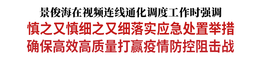 连线过程中,景俊海详细了解通化市当前全员检测、隔离管控、医疗救治、物资保障等工作进展情况,听取专家意见建议,对国务院应对新冠肺炎疫情联防联控机制吉林工作组提供的各方面支持帮助表示感谢,对正在通化疫情防控一线奋战的干部群众表示慰问。他强调,当前,通化疫情防控正处在关键阶段,必须高度重视、精准到位、上下贯通、一抓到底,认真落实“一精准三确保”要求,扎实做好外防输入、内防扩散、严防输出各项工作,确保疫情尽快清仓见底。要进一步落实提级管理措施,开展全域消杀,有效降低疫情传播风险。要进一步提升核酸检测质量效率,统筹省内资源和国家支持,集中调配机动检测队伍,加强人员统一培训,确保医护人员、物资设备等方面保障到位,推进采样环节流程标准化、规范化,保证检测结果准确可靠,并在此基础上有序开展疫苗接种。要进一步增强医疗救治力量,准备充足床位、药品,坚持中西医结合,严格落实诊疗方案,加强心理疏导、营养支持,集中专家和医护人员,对重症和危重症患者实行“一人一专班”,不惜一切代价救治每一名患者,严格做好医疗垃圾科学处置等工作,切实强化院感防控。要进一步加快隔离场所征集和临时隔离点建设,尽快投入使用,规范服务保障,防止交叉感染。要进一步严格闭环转运措施,全力保障交通安全,转运沿途要全面消杀、封闭管理。要进一步保障一线需求,关心关爱防疫人员,准备充足的N95口罩、防护服、护目镜等防疫物资,做好个人防护,保证休息时间。要进一步规范工作流程,分门别类制定工作手册,直接发放到一线工作人员手中,确保每个环节操作精确、执行规范,确保每项工作落细落小、落到实处。要进一步加强宣传教育引导,及时发布权威信息,主动回应社会关切。全省上下要拧成一股绳,全力支援通化防控疫情,齐心协力渡过难关,坚决打好打赢这场硬仗。
