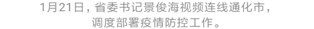 今天(1月21日),省委书记景俊海视频连线通化市,进一步调度部署疫情防控工作。他强调,要深入贯彻习近平总书记关于疫情防控的重要讲话重要指示精神,坚持把疫情防控作为当前头等大事,慎之又慎、细之又细落实应急处置举措,确保高效、高质量打赢疫情防控阻击战。国务院应对新冠肺炎疫情联防联控机制吉林工作组组长、国家卫健委党组成员、国家中医药管理局党组书记余艳红在通化市参加视频连线。
