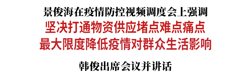 韩俊强调,要围绕“一精准三确保”要求,坚决把省委省政府关于“外防输入、内防扩散、严防输出”的具体部署落细落实落到位,各条线都要强起来。坚持一人一案,配齐配足力量装备,确保每位患者得到科学救治;加强统一调度,完善配送机制,充实每个小区服务力量,确保居民生活必需品需求得到满足;搞好困难群众帮扶,保障基本生活不受影响;加大信息发布力度,全方位反映抗疫工作,及时回应社会关切。加强监测评估,做好政策储备,帮助困难企业渡过难关。