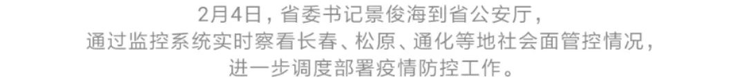 今天(2月4日),省委书记景俊海到省公安厅,通过监控系统实时察看长春、松原、通化等地社会面管控情况,并通过视频连线听取三地汇报,进一步调度部署疫情防控工作。他强调,要深入贯彻习近平总书记关于疫情防控的重要讲话重要指示精神,以责任担当之勇、科学防控之智、统筹兼顾之谋、组织实施之能,依法精准管控社会面,织密筑牢疫情防护网,坚决守住外防输入、内防扩散、严防输出关口,坚决夺取疫情防控最终胜利。