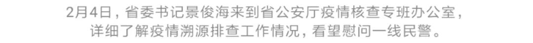 视频连线后,景俊海走进省公安厅疫情核查专班办公室,详细了解疫情溯源排查工作情况,看望慰问一线民警,鼓励大家科学运用大数据等手段,进一步加强人员排查和疫情溯源,精准识别重点人员,及时推送相关信息,提高基层防控效率,为打赢疫情防控硬仗发挥更大作用、贡献更大力量。