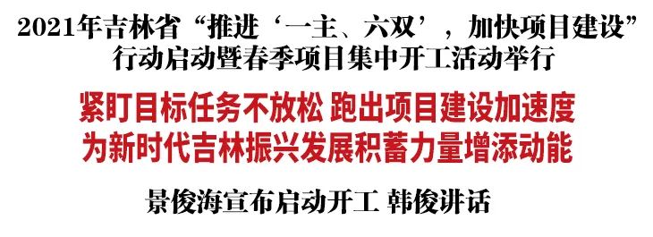 韩俊在讲话时指出,各地各部门要牢固树立发展是第一要务、项目是第一支撑的理念,把加快振兴发展的精气神凝聚在项目建设上,持续发力抢抓一季度、攻坚二季度、决胜上半年,力争全年项目建设取得更好成绩,为“十四五”开好局、起好步奠定基础。一要全力抢工期。督促前期手续快审批,推动项目建设能早尽早、能快则快。盯住全年投资序时进度目标,按照“五化”工作机制,层层压实责任,及时跟踪推进,奋力完成预期目标任务。二要全力保质量。围绕“一主、六双”产业空间布局,持续谋划一批科技创新、产业转型、生态修复、环境治理、现代农业、乡村建设、基础设施等重大项目,改善优化投资结构。引进一批业态新、投资大、效益好、带动力强的项目,进一步增强发展后劲。抓好施工安全,保证工程质量,确保项目顺利建成、早见成效。三要全力优服务。继续实行“要素保障跟着项目走”机制,土地、人才等向项目集聚,提升服务精准化水平。发挥各级项目中心作用,全流程跟踪项目建设进度,及时研究解决问题,创造最优条件。持续开展“服务企业周”活动,不断改善营商环境,吸引更多战略投资者来吉林投资兴业。