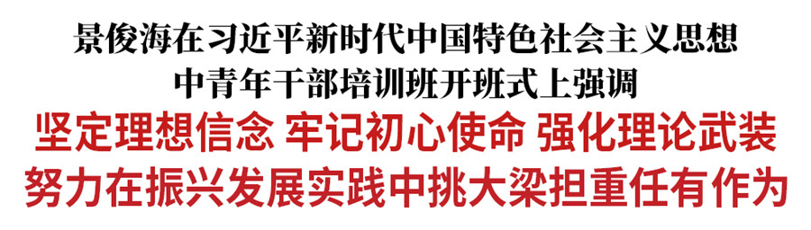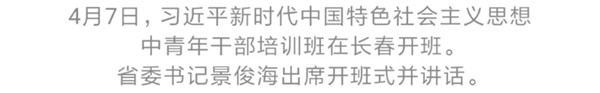 4月7日,省委书记景俊海出席习近平新时代中国特色社会主义思想中青年干部培训班开班式并讲话。他强调,要深入学习贯彻习近平新时代中国特色社会主义思想,进一步坚定理想信念,牢记初心使命,强化理论武装,努力在振兴发展实践中挑大梁、担重任、有作为,为加快新时代吉林全面振兴全方位振兴作出新的更大贡献。
