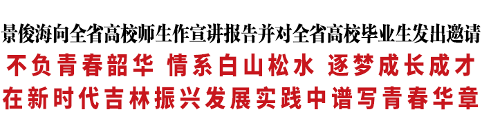 4月8日,省委书记景俊海在吉林大学出席“创业有你 ‘就’在吉林”助力新时代吉林振兴发展首场宣讲报告会,走近师生、说理话情,向在65个分会场、556个视频点以及通过移动端收看的全省近100万人作宣讲报告,为大家上了一堂生动的思政课,并对全省高校毕业生发出邀请:牢记习近平总书记殷切嘱托,不负青春韶华,情系白山松水,逐梦成长成才,在新时代吉林振兴发展实践中谱写青春华章。